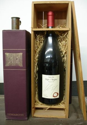Cantine Lungarotti Title: Sign/Segno Sponsor: Fondazione Lungarotti & Comune Di Torgiano Location: Cantine Lungarotti Torgiano (Perugia), Italy Materials: Steel, ceramic, Wine and Photographic Paper/ 100 Signed and Numbered Bottles Dimensions: 32 Units, Each of 3.94"X 3.94", 9.84", Each of 10cmX10cmX25cm Date: July 22, 1994 |