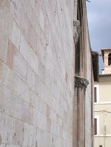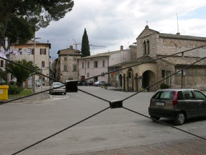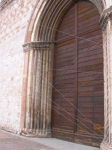 The History Looking back through the history of art and Italian art in particular, we see the importance in both the aesthetic and civic role played in church art and architecture. Foremost among this activity is the use of the church door or portal as a vibrant subject for artistic endeavor. We can look back, for only one example, at the accomplishment of Lorenzo Ghiberti "Doors of Paradise" for the Baptistery of the Duomo in Florence. The subject of a fierce competition to create an artwork that would equally display the talent and devotion of the artist but express the civic pride that Florence took to be its rightful place in the world. In this way the doors offer the promise, for those who pass, of the many layered rewards of those who control the interior space that the open in towards. Paradise was the subject of another Florentine; Dante who connection with Foligno is rooted in the first printed text of his masterpiece produced here. This connection is not casual and represents another link in our collective histories. In another example, the city uses its own gates or doors to both protect and open itself up to its surroundings. They can be seen a metaphor to express the willingness and state of mind that allows for the equal exchange of ideas and positions regardless of the size of the municipality that offers its forum. Foligno has its own rich and mostly undiscovered history with rich links to many moments in the history of culture of the Western world. Unfortunately most of it is unknown by those outside of the city itself. The Site & The City: Foligno Foligno is unique in Umbria as representing the only true urban city in the Province. With its position on a large flat plain and its combination of historical center and its phases of development including the 1800's as well as the modern post war it displays all the characteristics of a city in a modest, but interesting, scale. The Piazza of San Dominico in Foligno is an exceptional situation that affords the possibility to address a series of issues about the urban experience. First amongst these is the presence of the various structures of different historical eras. Ranging from the Roman through the Medieval and Modern, the buildings articulate the very concept of "strata" or levels that mark the passage of time and gesture in urban life. The oval traffic circle with its large palm trees and light fixtures literarily guides one around to the north end of the piazza. There one is confronted by the unfinished façade of the ex-church of San Dominico with its large-scale wooden doors seemingly permanently closed. Now functioning as a civic hall and theater, its entrance has been moved to the side access at the rear of building. The piazza and the change of function of the ex-church create for me a proposal of the change in urban fabric where the past is reinvested with meaning by the application of a new function for both the building and its context. The Project The project for the doors/entrance for the ex-church of San Dominico is best articulated by describing the elements of the installation. From various points across the ex-church, stainless steel cable will be strung, intersecting as they transverse the frame from top to bottom and side to side. The stainless steel cable will to affixed to the existing points of nails, rings and other metal elements which have been added to the façade over its long history. At various points a self-developing photographic paper (Printing Out Paper/POP) will wrapped and keep in place by wire on the intercrossing cables. The paper reacting to the ambient light will "mark" itself by leaving a lighter tone at the point where the cable touches the photo surface. The Concept As I have stated in my introduction the idea of doors and portals have created a powerful image, both visually and intellectually in the history of urban culture. The concept of my installation lies in the creation of an open random grid like structure, represented in the crossing stainless steel cables, that act as a aperture through which one can enter through and access the inner-space of the past (ex-church), present (civic hall) and future (the piazza's planed restoration). The photographic paper held in "tension" represents the important though precarious position of each of us in our attempt to enter these "Doors of Paradise" as members of the contemporary urban mass. We like the photographic paper are "marked" by our/its contact with this structure. We are both the passenger and the guide that make our way in this city that presented Dante and his voyage to the world. |